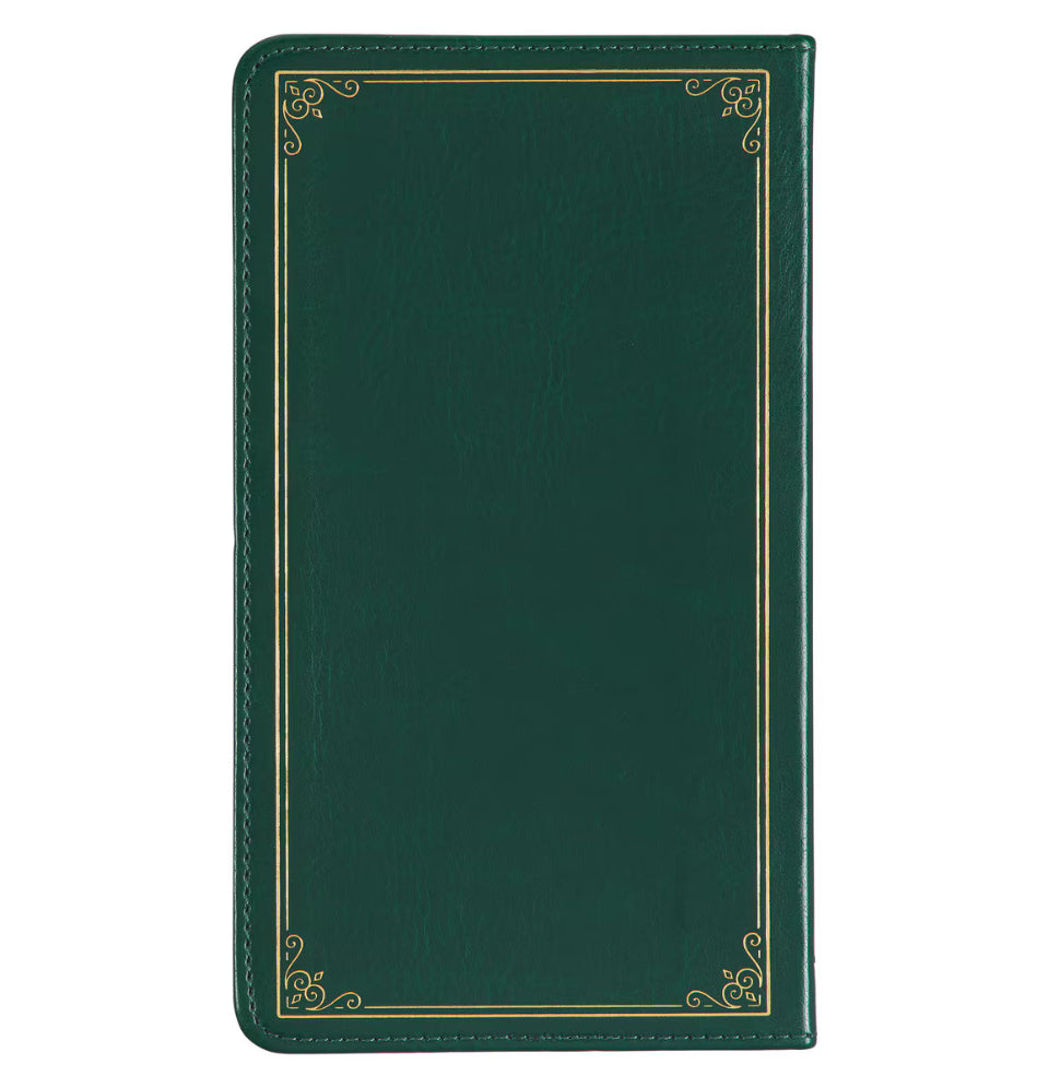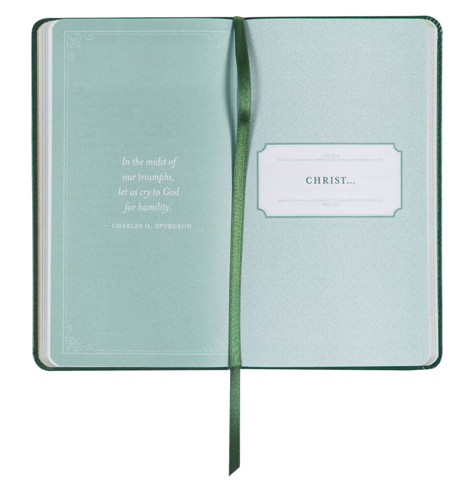 The softcover devotional exudes elegance with its luxurious green faux leather cover, tastefully embellished with a beautiful gold-foiled frame accentuated by delicate corner scroll designs. Subtle heat-debossed decorative lines grace the cover, adding a refined touch. The title is elegantly displayed in a combination of white and gold-foiled letters, further enhancing the aesthetic appeal.