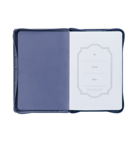 A gold metal zipper pull featuring a cross engraving keeps the journal's blue zipper securely closed, protecting its pages. To enhance durability, the cover has rounded edges reinforced with topstitching. Plus, there's a handy ribbon marker included to help you keep track of your page.