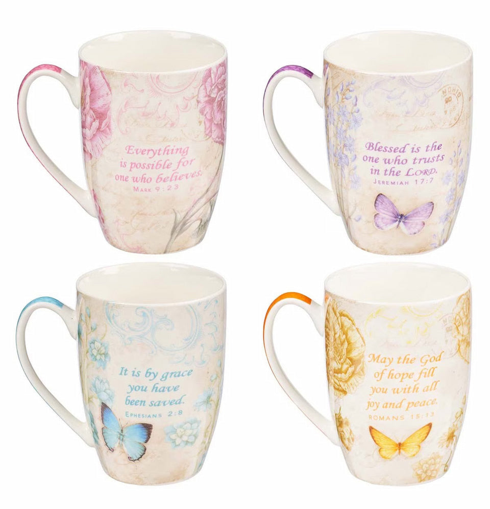 The Butterfly Blessings Mug Set is a testimony to the new creation we become when we abide in Christ. The butterfly has often been symbolic of new life . . . as we emerge from a chrysalis bound up in spiritual death and sail into a new world of freedom! That’s what the Butterfly Blessings Mug Set is all about—highlighting the Hope, Grace, Belief, and Blessedness of soaring with God.