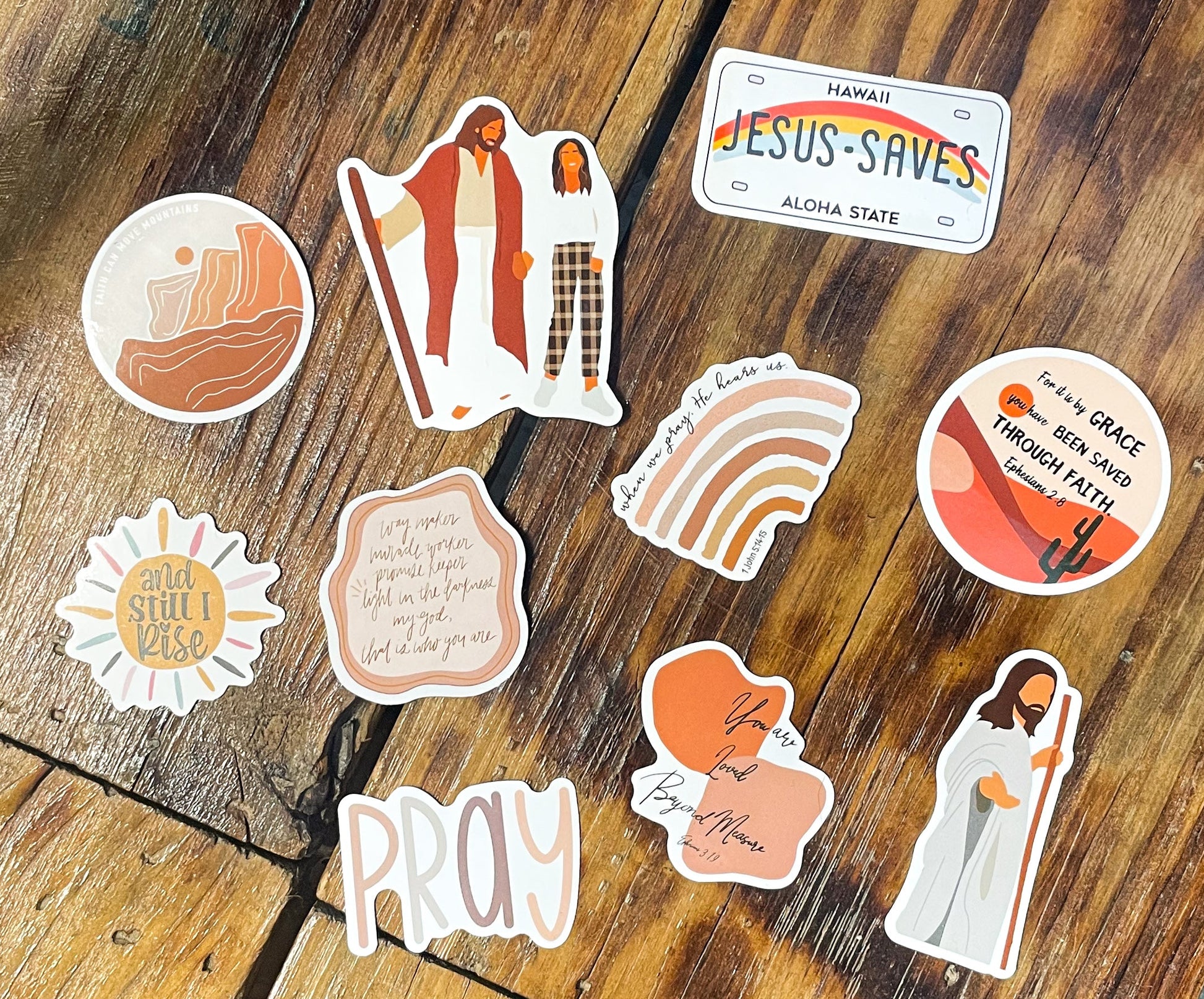 Get ready to fall in love with your new Christian Stickers! The Inspirational Jesus Stickers are great for adding flair to any journal, water bottle, or book! They are made of high quality vinyl and are water resistant! Easy to apply and remove! These religious stickers also make for the perfect Christian gift!!