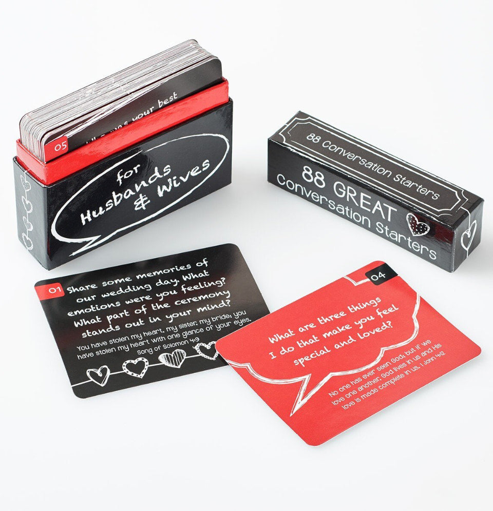 The 88 Great Conversation Starters For Husbands and Wives is a great size to fit into a stocking stuffer or to take with you on a date night. Give the gift of your time and attention when you give the 88 Great Conversation Starters For Husbands and Wives as part of a birthday or anniversary gift!