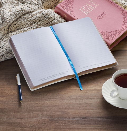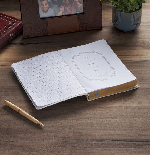 Beautiful gilt-edged pages pick up the golden theme and bring it to each page edge. The interior pages are all lined, and each has an additional Scripture verse printed at the bottom. There are 366 pages. Personalize the presentation page at the front of the journal with a meaningful message when you decide to give it as a gift. A cream-colored satin ribbon marker is attached to the spine to use as a page marker.