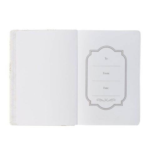 A gorgeous taupe rose design stretches across the front cover of the white faux leather cover. At the heart of the design, a white circular frame edged in gold foil with the Scripture reference cleverly incorporated in gold foil, holds the sentiment.