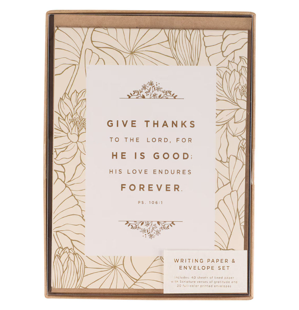 Give Thanks White and Gold Writing Paper and Envelope Set - Psalm 106:1