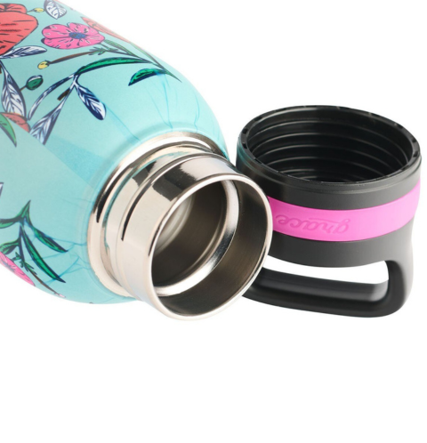 The lovely stainless steel water bottle offers superb quality. A stainless steel, double-walled interior insulates and maintains both hot and cold beverages for hours, and the plastic cap vacuum-seals the bottle for additional insulation. Hook a finger through the built-in handle on the lid for easy carrying. Protect this bottle's gorgeous decal design by hand-washing it only and never putting it in the dishwasher, microwave, or freezer.
