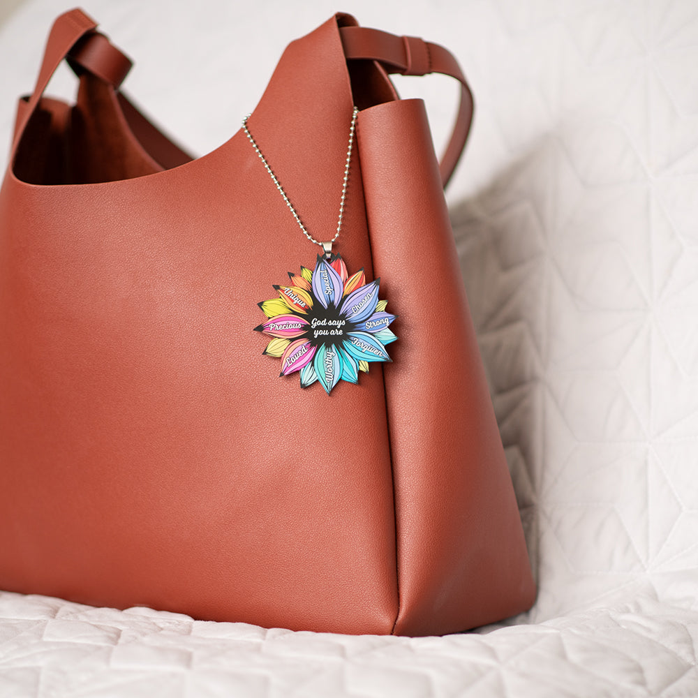 Celebrate who you are in Christ with this flower-shaped acrylic ornament, blooming with color and a message of true identity. Measuring approximately 3.2 inches wide and paired with a 9.5-inch silver ball chain, it’s a joyful reminder of your worth in God’s eyes.