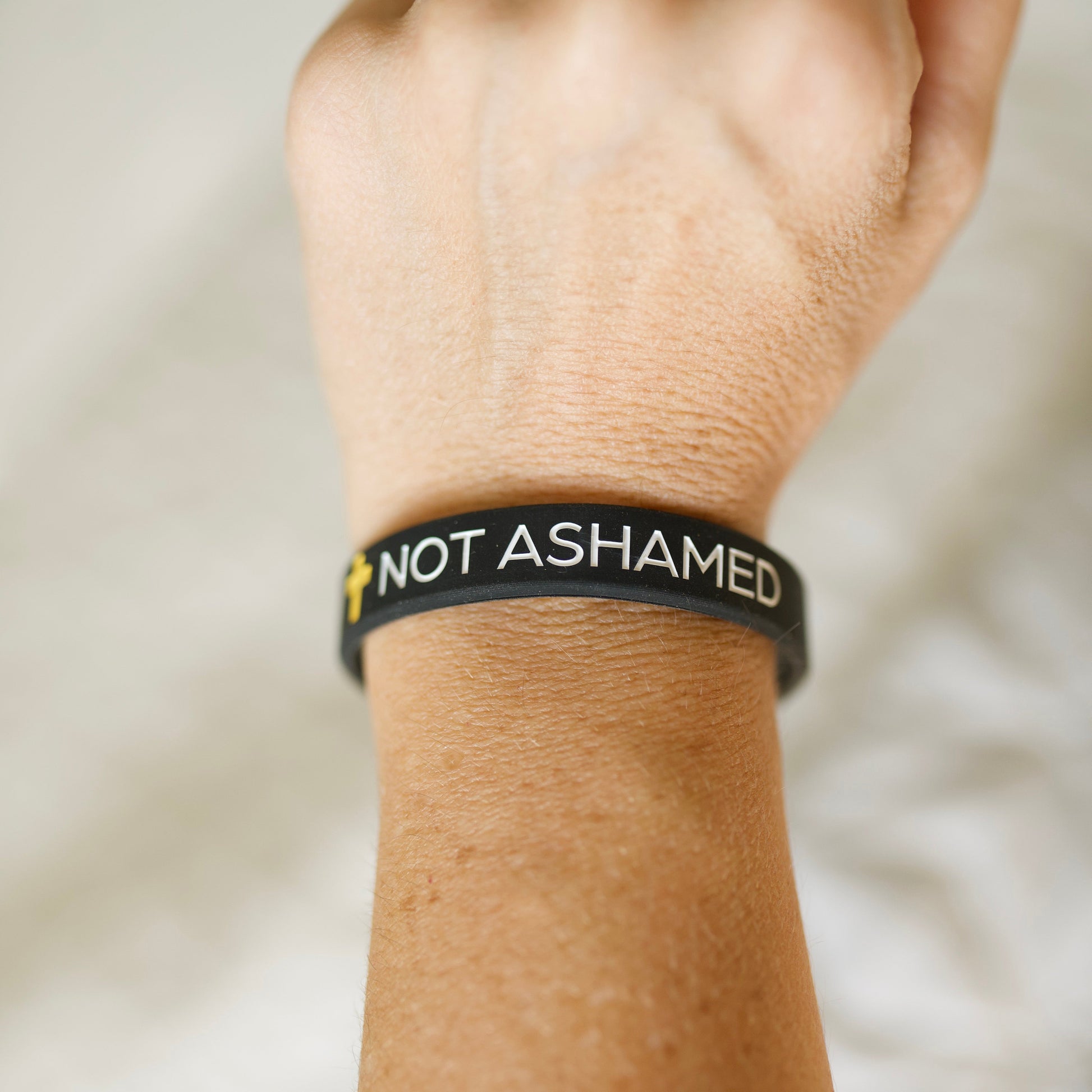 The Not Ashamed Black Inspiration Bracelet features the proclamation "Not Ashamed" and the image of a bold cross, with the corresponding verse of Romans 1:16. This verse symbolizes a confident commitment to sharing the message of Christ without fear or hesitation, recognizing the gospel as the source of God's power to save all who believe.