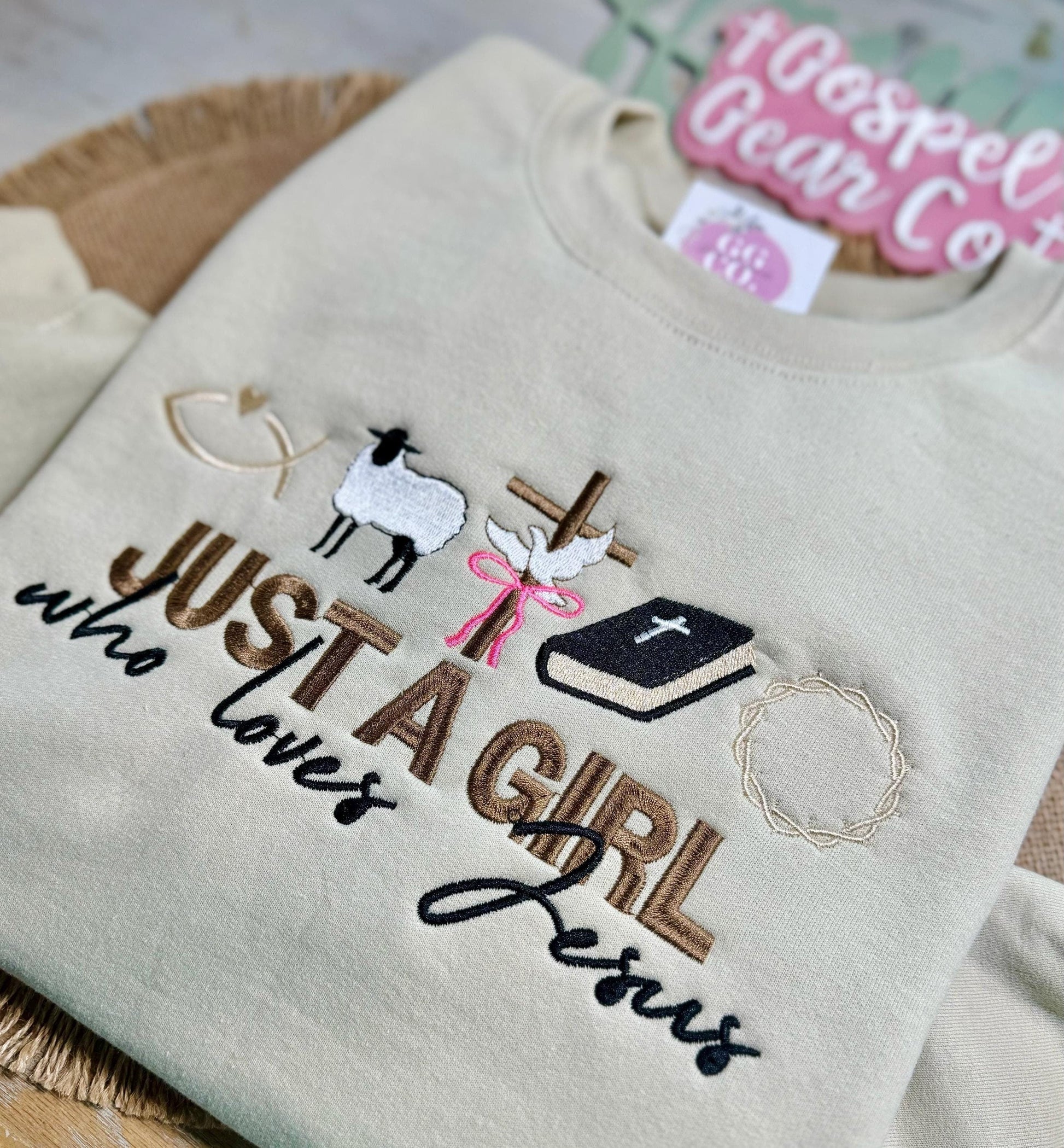 Just A Girl Who Loves Jesus Embroidered Shirt, Embroidered Pullover, Christian Sweatshirt, Jesus Pullover, Christian Gift, Christian Tee