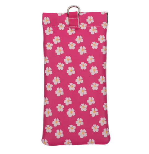 The dual slip pocket eyeglass case perfectly blends two pink floral designs. The larger pocket features a solid pink background accented with light pink blossoms, while the smaller pocket boasts a soft pink backdrop framed by an arrayP of pink and orange flowers, creating a canvas for the black-lettered sentiment.