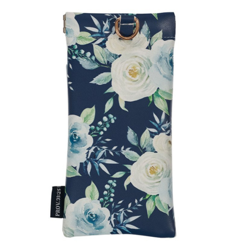 The Strength and Dignity Indigo Rose Faux Leather Double Eyeglass Case is part of the Strength and Dignity Indigo Rose Collection. This collection includes a Box of Blessings®, an epoxy-filled metal keychain, a compact mirror, a gift pen, a ceramic coffee mug, a magnet set, a zippered faux leather journal, a wirebound journal, a faux leather eyeglass case, a faux leather Bible case, and a large gift bag.